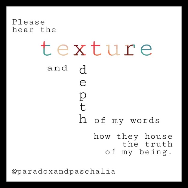Words: A Poem by Collette Kristevski 1 Reply Please hear the texture and depth of my words – how they house the truth of my being. //Words //Collette Kristevski, 2/19/2019 Share this: Click to share on Facebook (Opens in new window) Facebook Click to share on X (Opens in new window) X Click to share on Tumblr (Opens in new window) Tumblr Click to share on Pinterest (Opens in new window) Pinterest Like Loading... Related